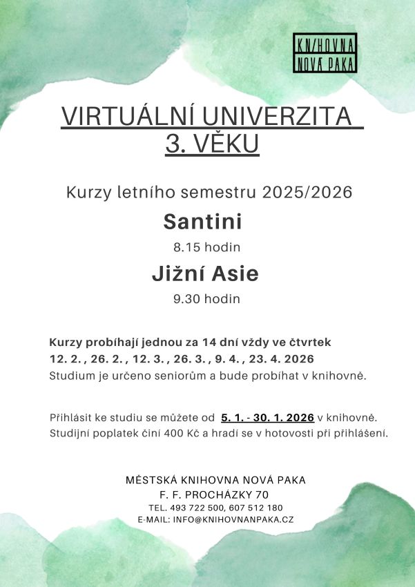 Městská knihovna v Nové Pace nabízí zájemcům možnost studia Virtuální univerzity třetího věku. Jedná se o dlouhodobou společenskou aktivitu v oblasti seniorské výuky, jejímž cílem je zpřístupňovat tento způsob vzdělávání zájemcům, kteří se nemohou účastnit prezenčního studia. Studijním i organizačním garantem projektu je Provozně ekonomická fakulta ČZU v Praze.